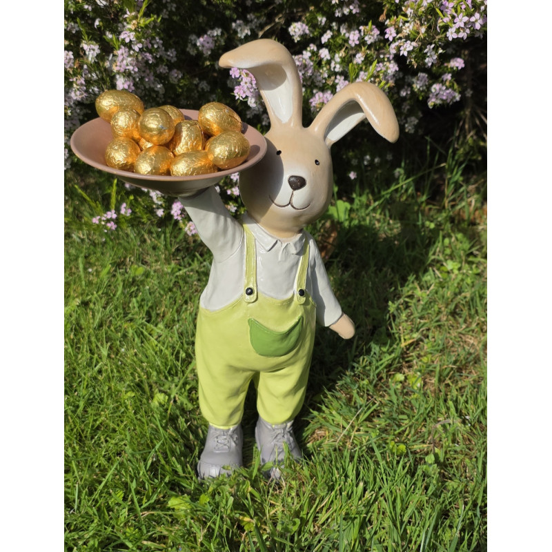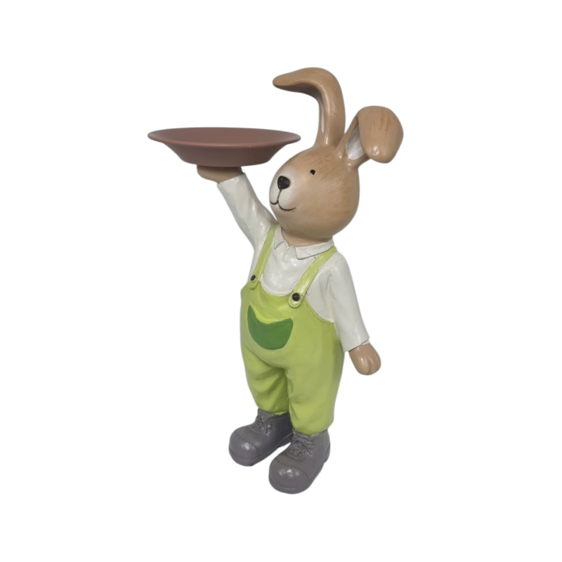 Figura de polirsena de un conejo con bandeja vestido con peto verde y camisa blana.