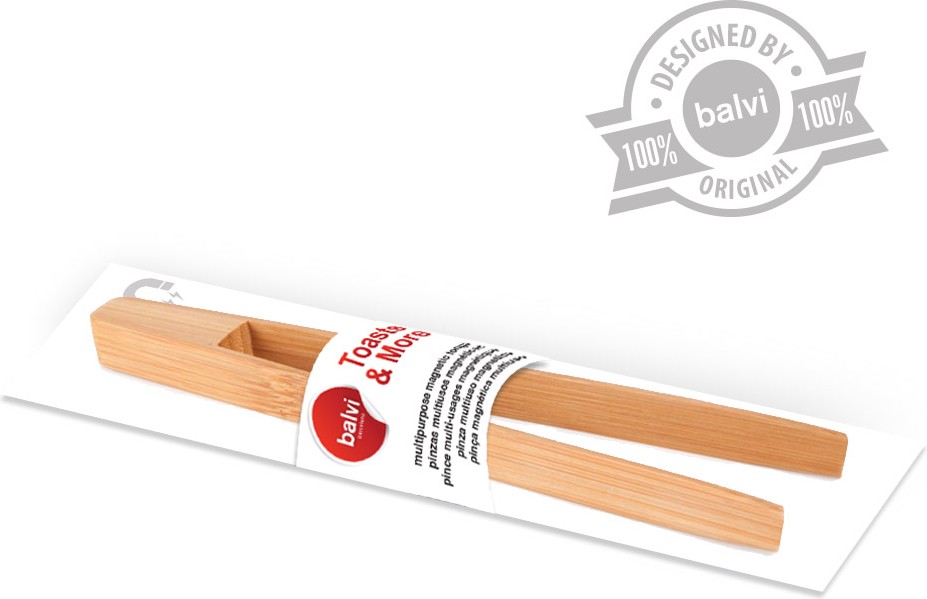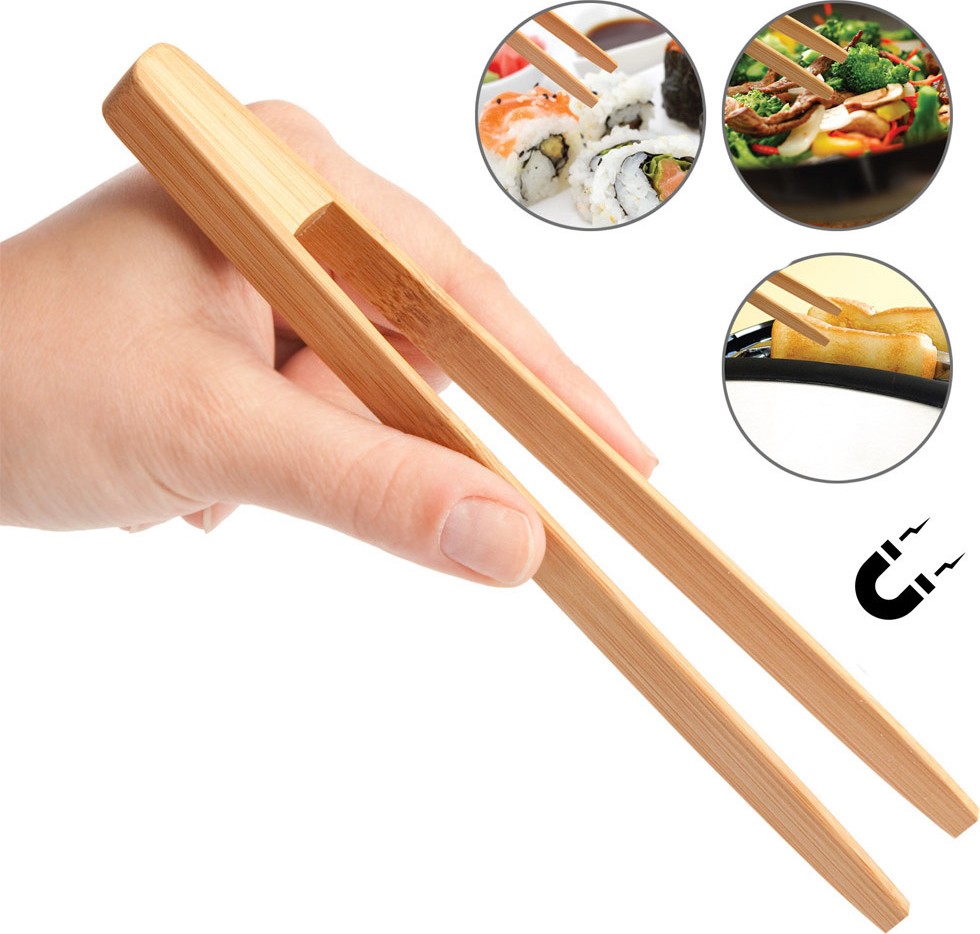 Pinza de bambú ideal para sacar tostadas de la tostadora, para comer sushi o para servir ensaladas. Lleva un imán para sujetrala a una superficie metálica.
