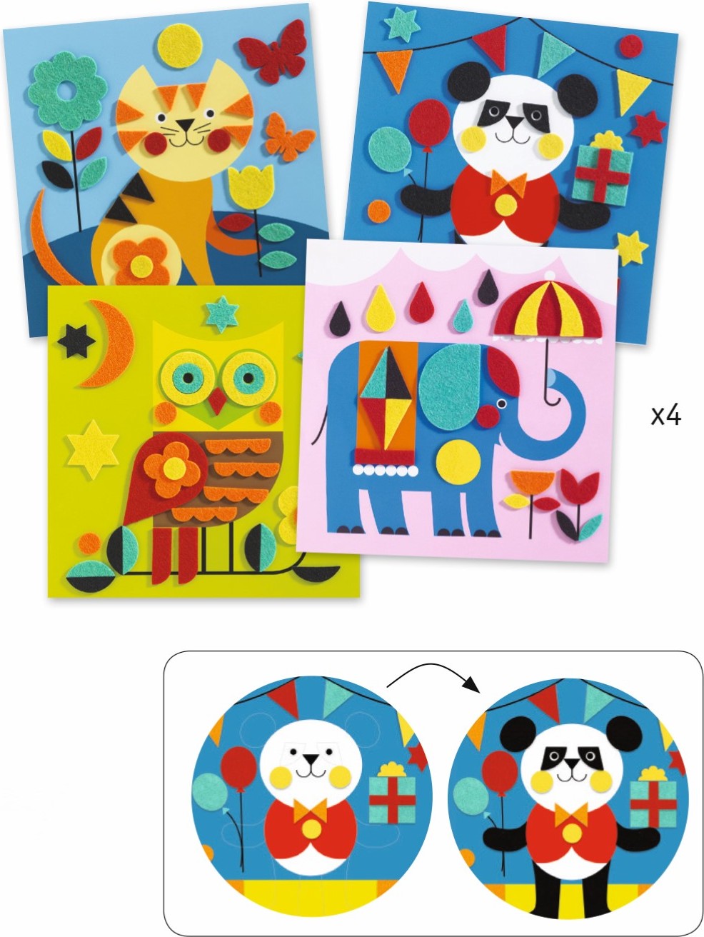 4 láminas con unos simpáticos animales con más 100 figuritas de fieltro para pegar. Con el collage los peques desarrollan la destreza al manipular los elementos que se pegan. También aprenden a identificar las formas, los tamaños, los colores y las texturas. Edad recomendada 3-6 años.