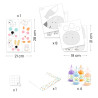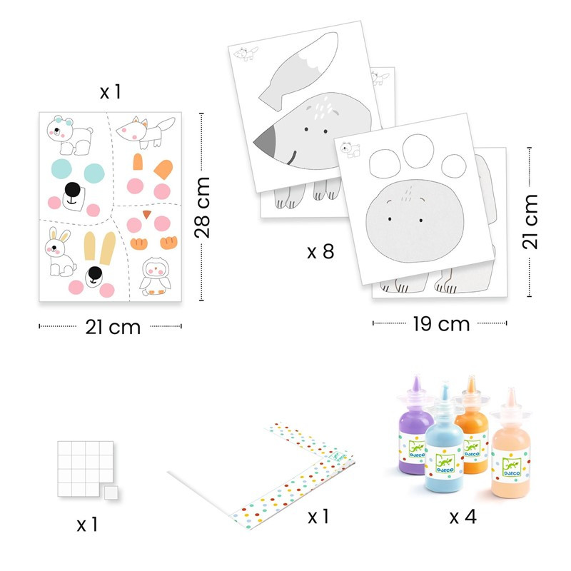 El set incluye: 8 láminas de cartón grueso precortadas e ilustradas, 1 hoja de pegatinas, 4 botes de pintura de dedos, 1 protector de mesa e instrucciones.