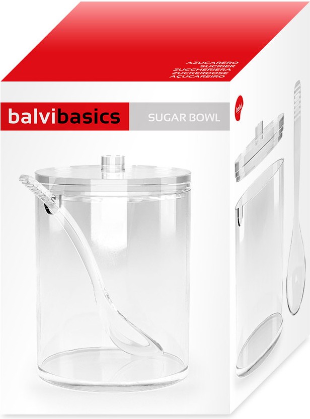 Azucarero acrílico, con capacidada de 250 gr y que incluye una cucharilla.
